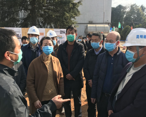 2020年2月14日,昆明市副市长高中建、周红斌到由昆明交投公司下属昆明建投建设工程集团有限公司(以下简称“昆明建投”)负责承建的新冠病毒应急病房项目施工现场视察指导工作。昆明市住建局、昆明市卫健委、昆明交投公司、安宁市政府、市第三人民医院、安宁市住建局、安宁市自然资源局、昆明建投主要负责同志陪同。