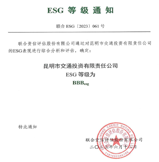 昆明交投公司获得联合资信BBBesg评级