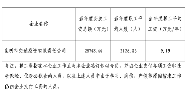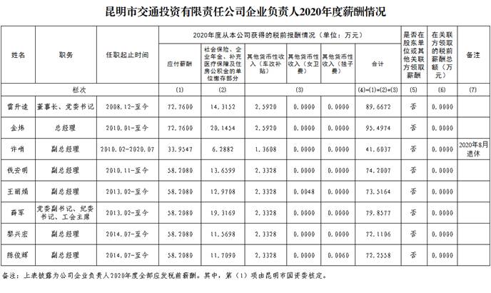 昆明市交通投资有限责任公司企业负责人2020年度薪酬情...