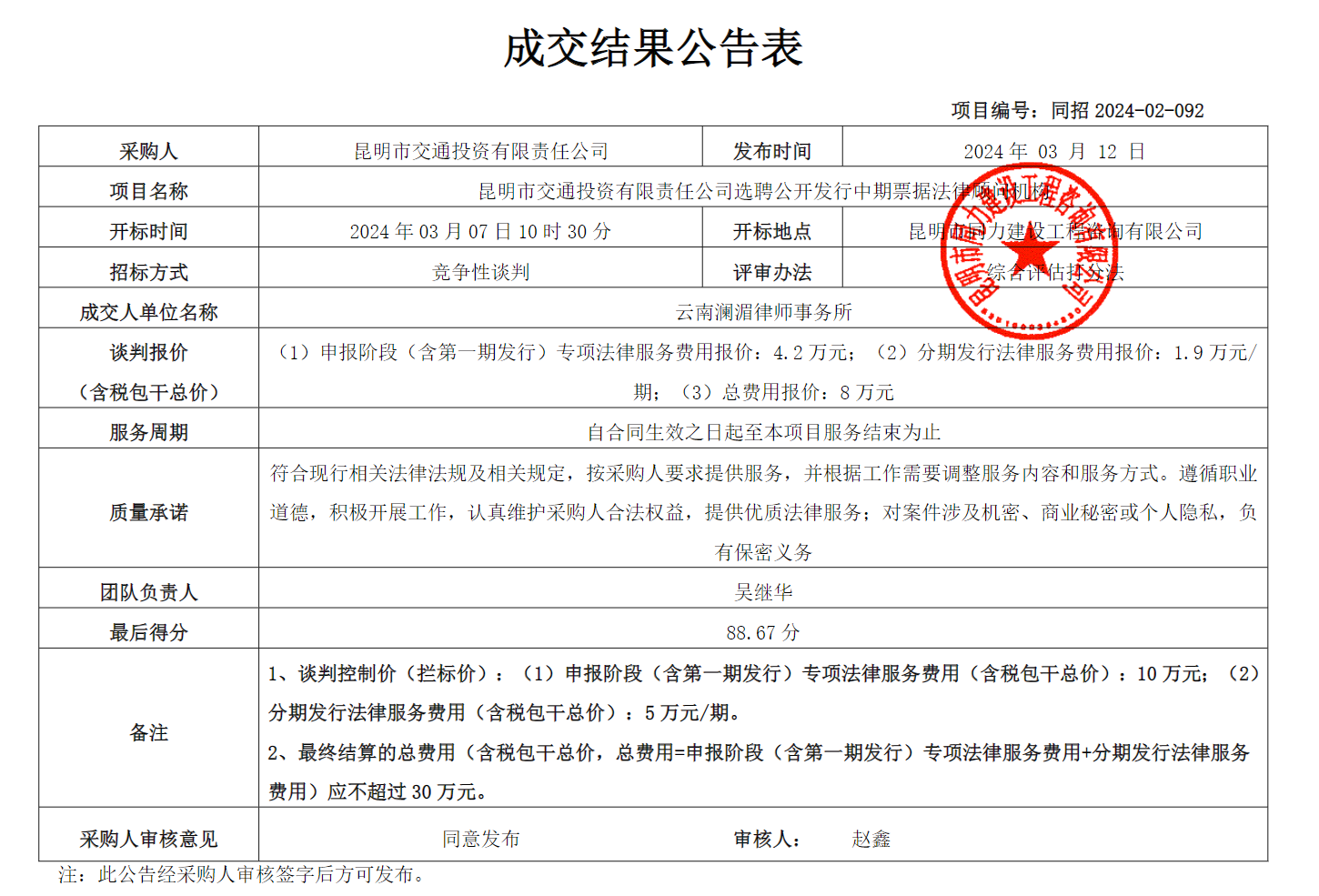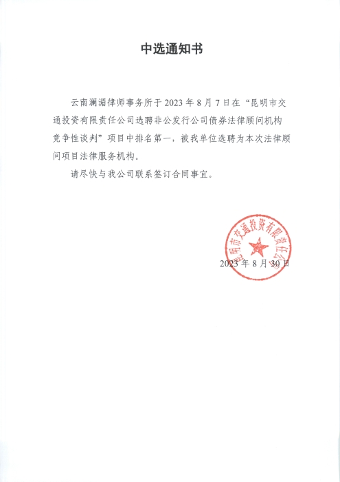 昆明市交通投资有限责任公司选聘公开发行中期票据法律...